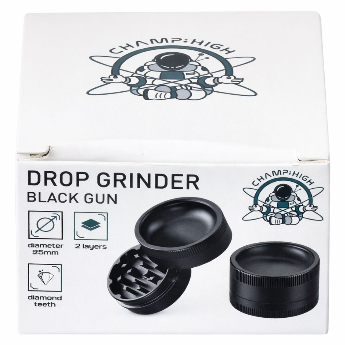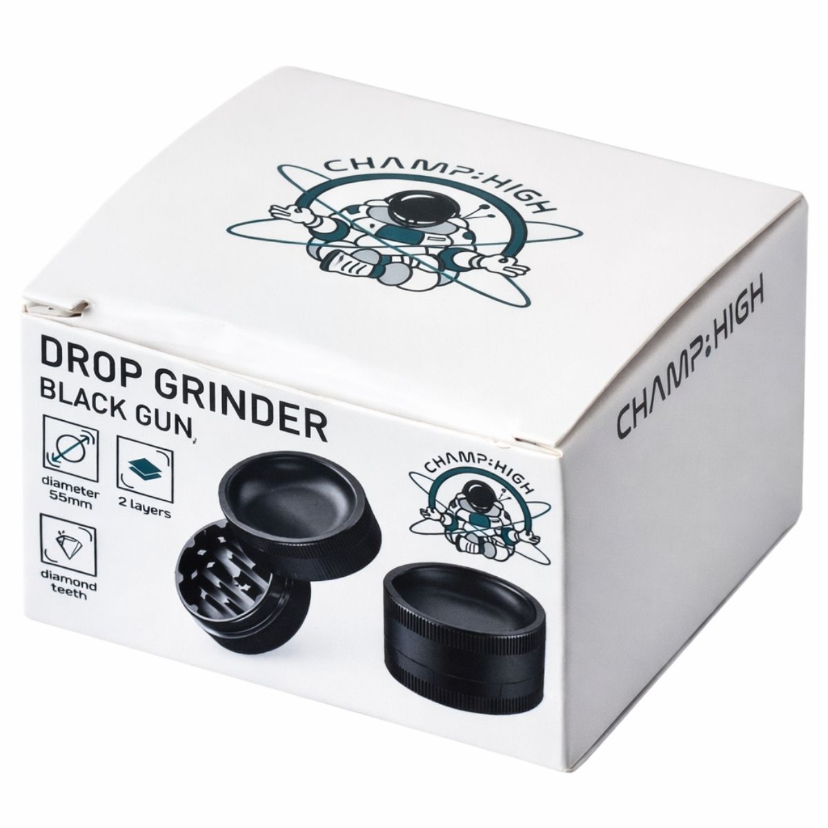 The Champ High Black Gun Drop Grinder is a novelty grinding accessory developed for adult use smoking accessory markets. Featuring a distinctive gun drop-inspired shape, this grinder combines decorative styling with practical grinding functionality, making it suitable for lifestyle oriented and novelty focused retail environments. The black finish delivers a clean and uniform appearance that supports consistent presentation across display assortments.