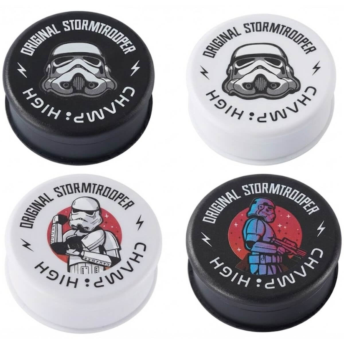 - 12 × Champ High Original Stormtrooper Plastic Grinders (60mm, 3-part, plastic)
