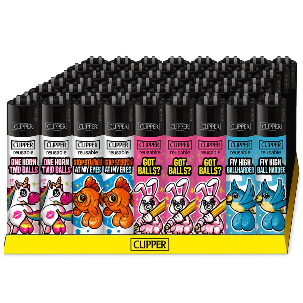 The Clipper Classic Big Balls (48pcs/display) is a humorous, adult-oriented lighter assortment featuring bold and playful designs in Clipper’s trusted reusable format. Built with a refillable gas tank, replaceable flint system and durable nylon body, these lighters offer long-lasting functionality paired with collectible visual appeal. Ideal for lifestyle retailers, headshops and impulse-buy zones, this display delivers consistent turnover and strong customer engagement.